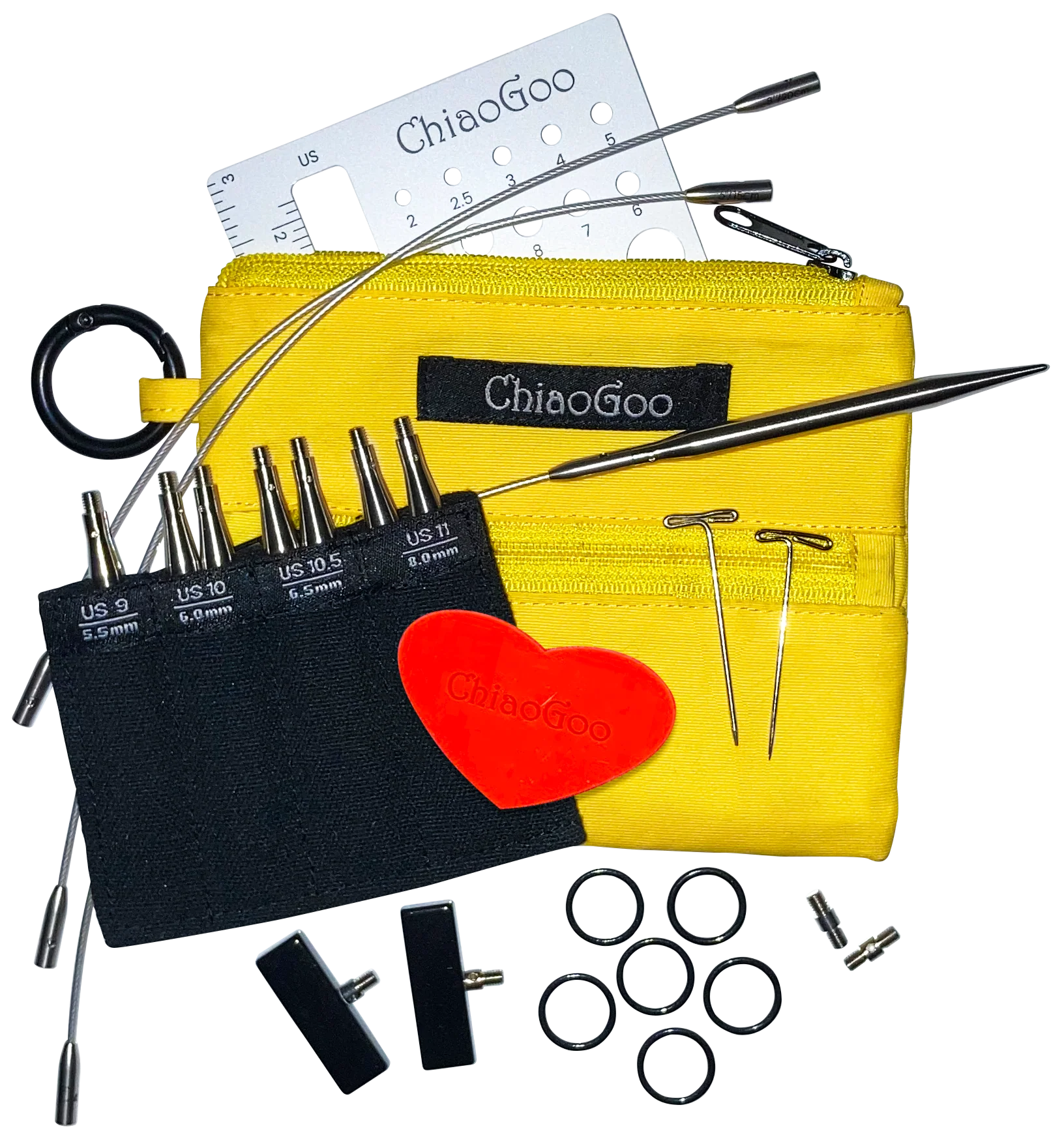 - The set comes in a nylon, yellow pocket pouch and includes three SWIV360 cables (two 6″ and one 8″), end stoppers, connectors, stitch markers, a swatch/needle gauge, heart-shaped gripper and tip sleeve.
