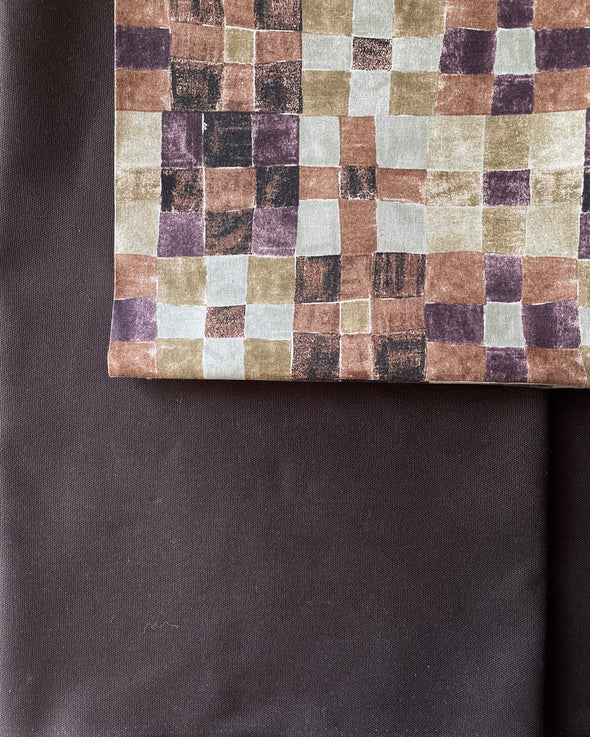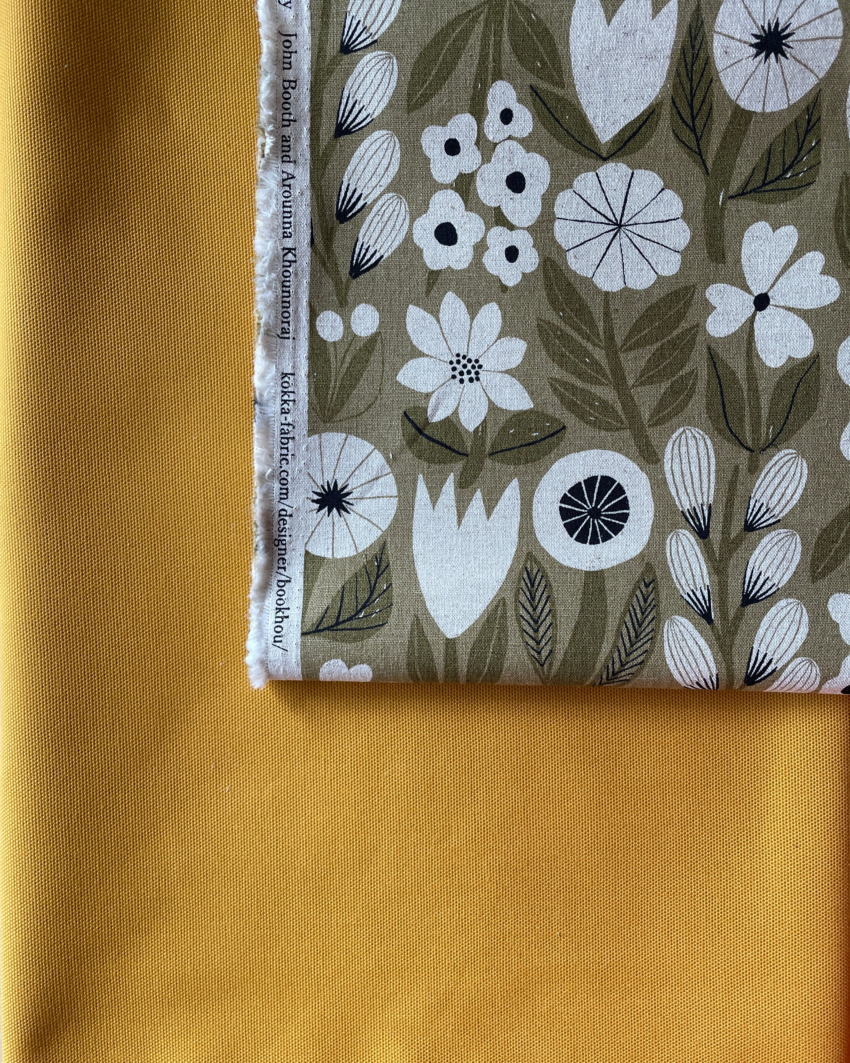 Our bundle comes with everything you need to sew the tote. Our sample uses Big Sur Canvas for the exterior and a fun cotton/linen canvas for the interior pocket and water bottle sleeve. We sewed the external pocket, as well as the internal pockets and water bottle sleeve, and of course added the zipper closure. Our sample uses a print from a previous Ruby Star collection that we no longer have in stock, so we have paired the new Bookhou Gather collection for this bundle. We have included enough fabric to sew all of the optional features.