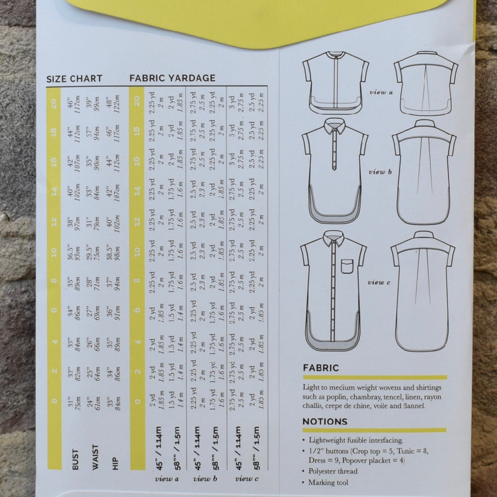 Make a fluid, drapey Kalle with soft fabrics like tencel, linen, rayon challis and silk crepe de chine. Crisper fabrics like poplin, chambray, voile, flannel and traditional shirtings will create a more structured silhouette.